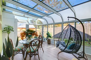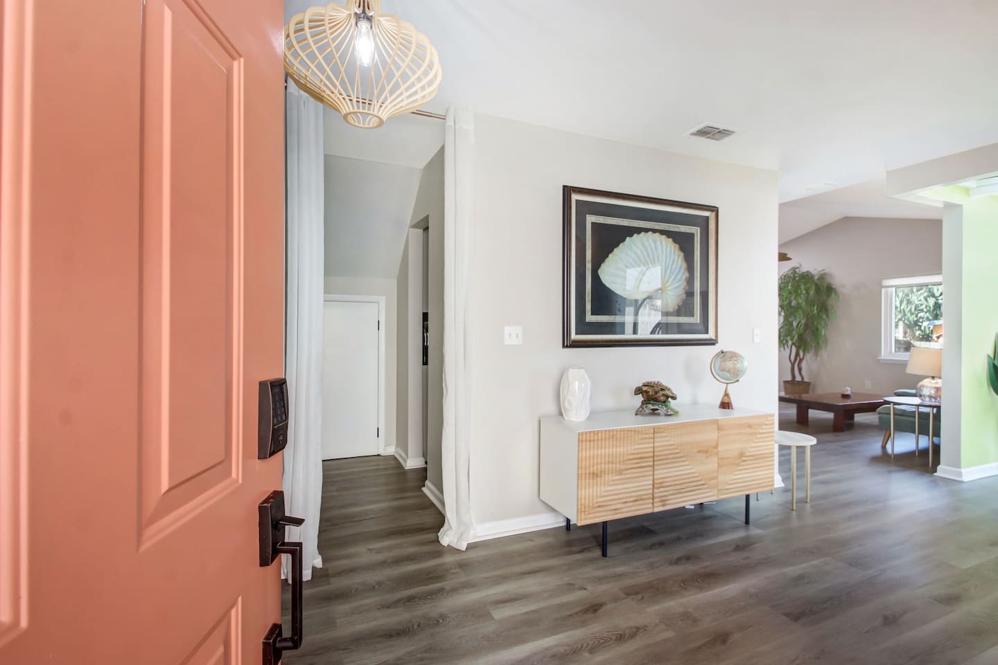 Discover the Sea Glass House, an IG-worthy retreat just one mile from Hanna Park's pristine beach and 447 acres of coastal hammock! This curated experience features stunning design elements from unique antiques to whimsical artwork and an indulgent solarium with hanging egg chair and illuminated cherry tree.