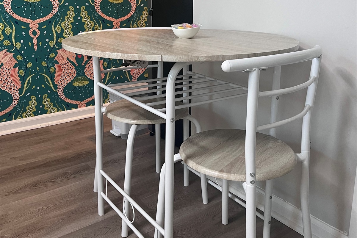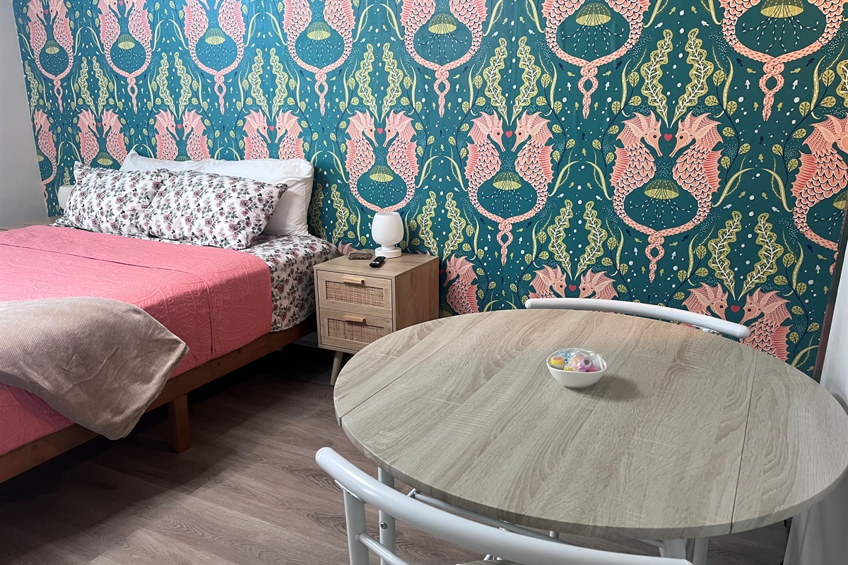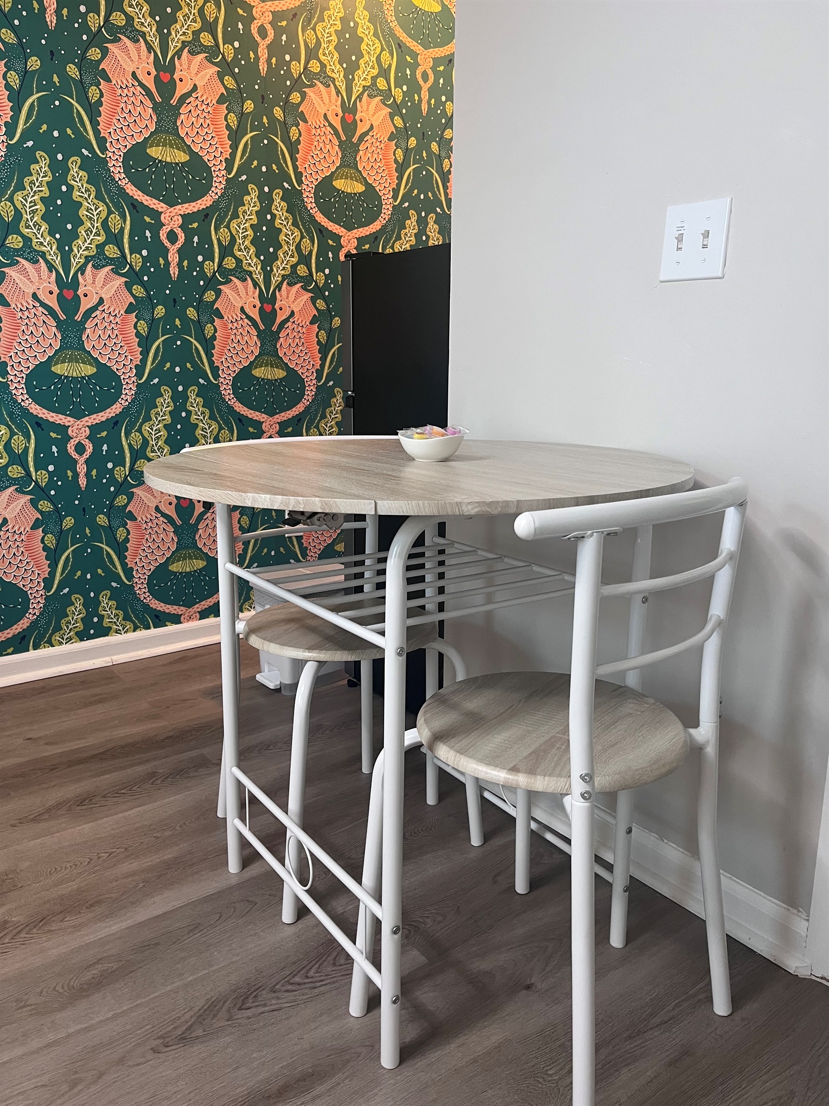 The stunning bathroom showcases an oversized shower with dual shower heads - a true luxury in a compact space. Beautiful seahorse wallpaper adds coastal charm and whimsical character throughout.